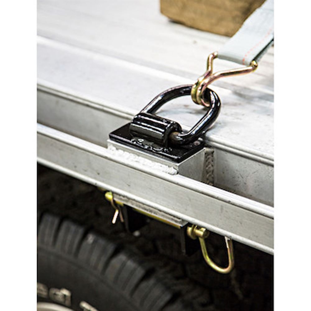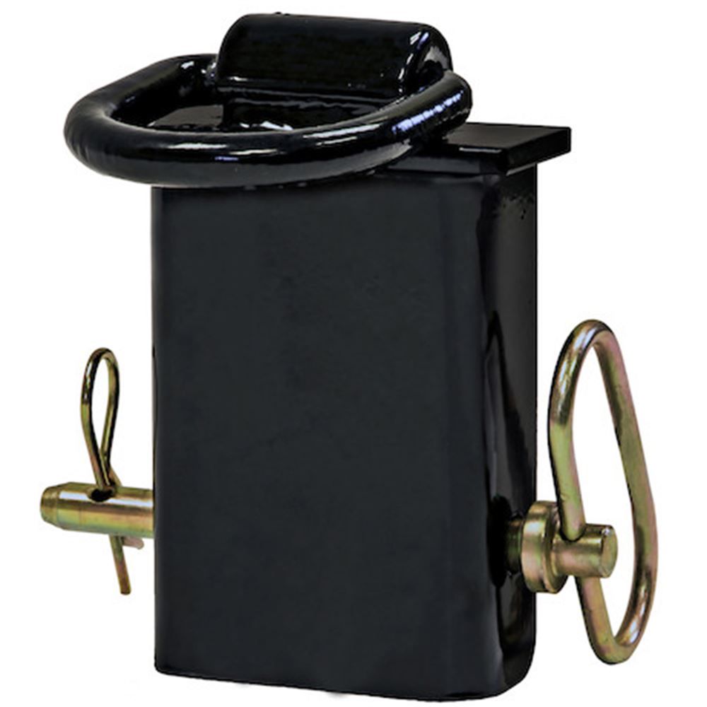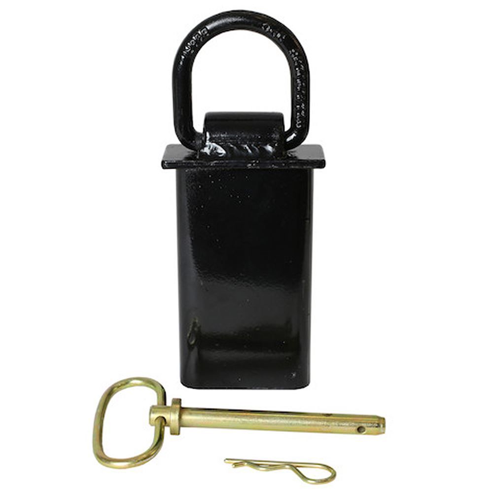 This handy product features a sturdy, forged steel 1/2-inch D-ring with a 2-1/2-inch internal diameter, a black powder-coated finish, and a hitch pin with cotter. It fits conveniently in common flush and outside stake body pockets.
