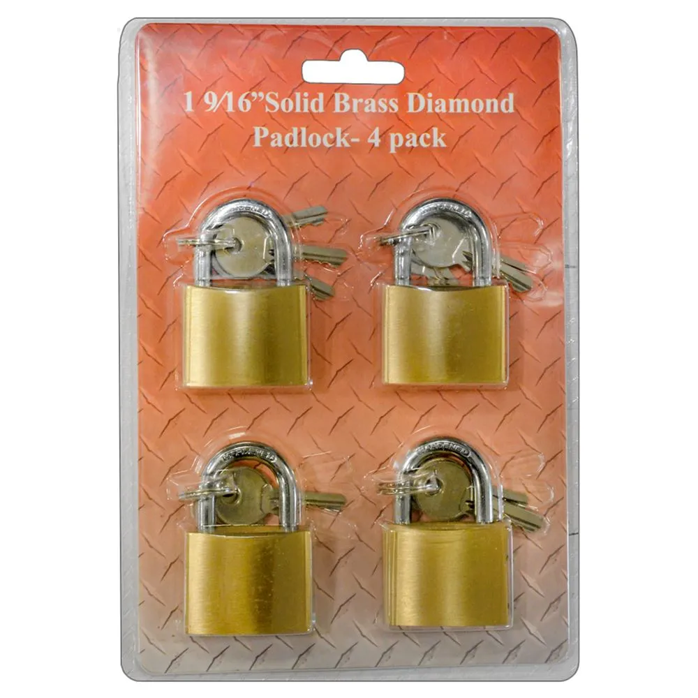 This 1-9/16" brass diamond padlock is rust and corrosion resistant and is made of hardened steel. This padlock has a brass pin cylinder that helps resist picking.