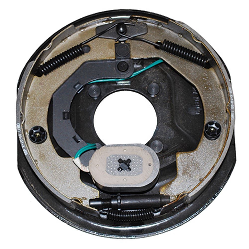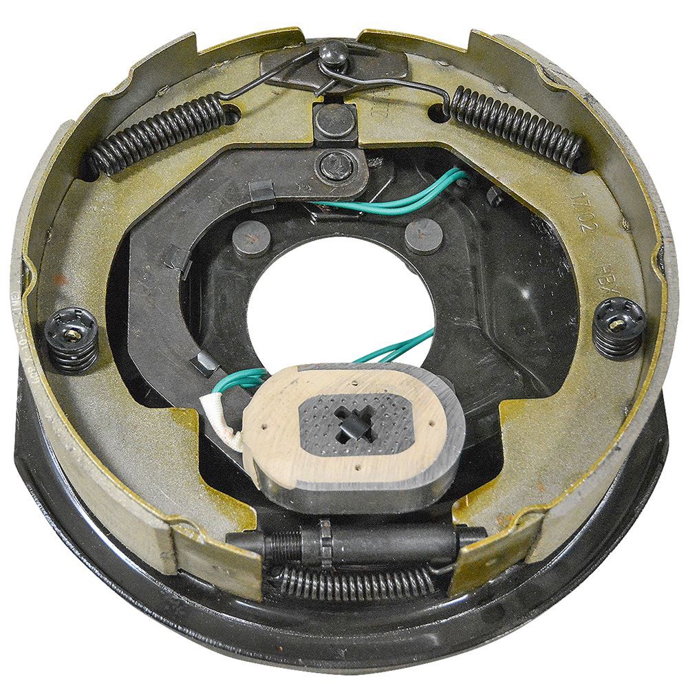This left-hand 10-inch x 2-1/4-inch electric brake assembly is designed to be mounted on the left-hand side of the trailer's axle and provides braking power when the tow vehicle's brakes are applied.
