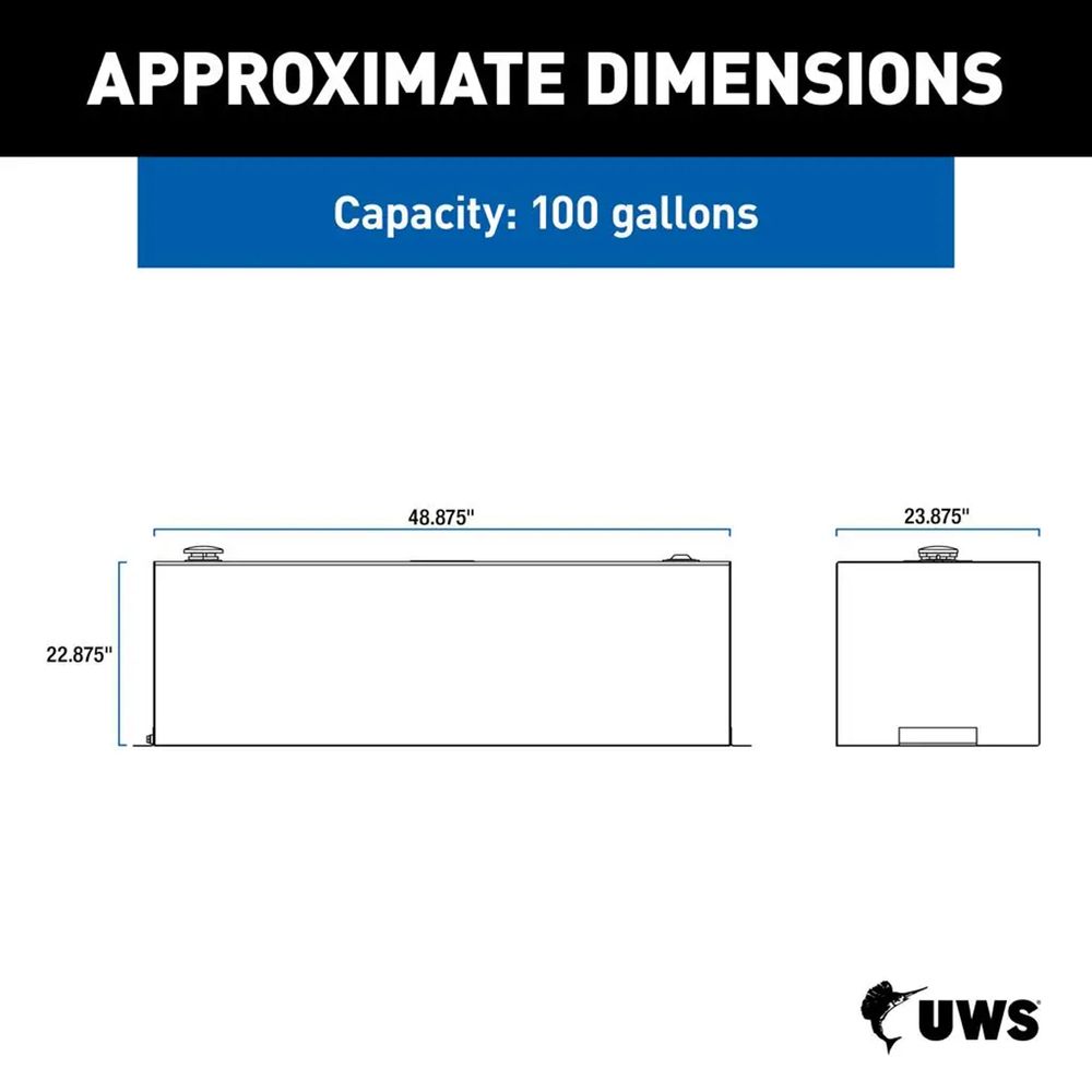 This UWS® 100 Gallon Steel Transfer Tank features construction from 14 Guage high strength steel. The white powder coat finish is corrosion resistant and 1/8 inch tabs can be used to mount the tank securely to your pickup bed. Welded hooks provide a means to easily lift the tank in and out of the truck when needed. The cap is key operated to prevent tampering. Internal baffles prevent contents from sloshing while on the road.