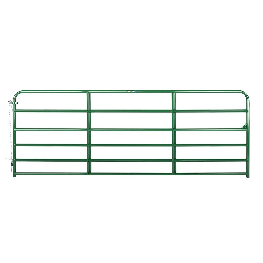To secure your property or livestock, Tarter's American Gate is perfect for many applications on your land. Ideal for a 12 foot opening, this gate is made from a high tensile steel 1 3/4-inch tubing and is powder coated green for durability. This gate includes hinge pins, snap chains and welded chain latch. One year warranty on defects/workmanship.