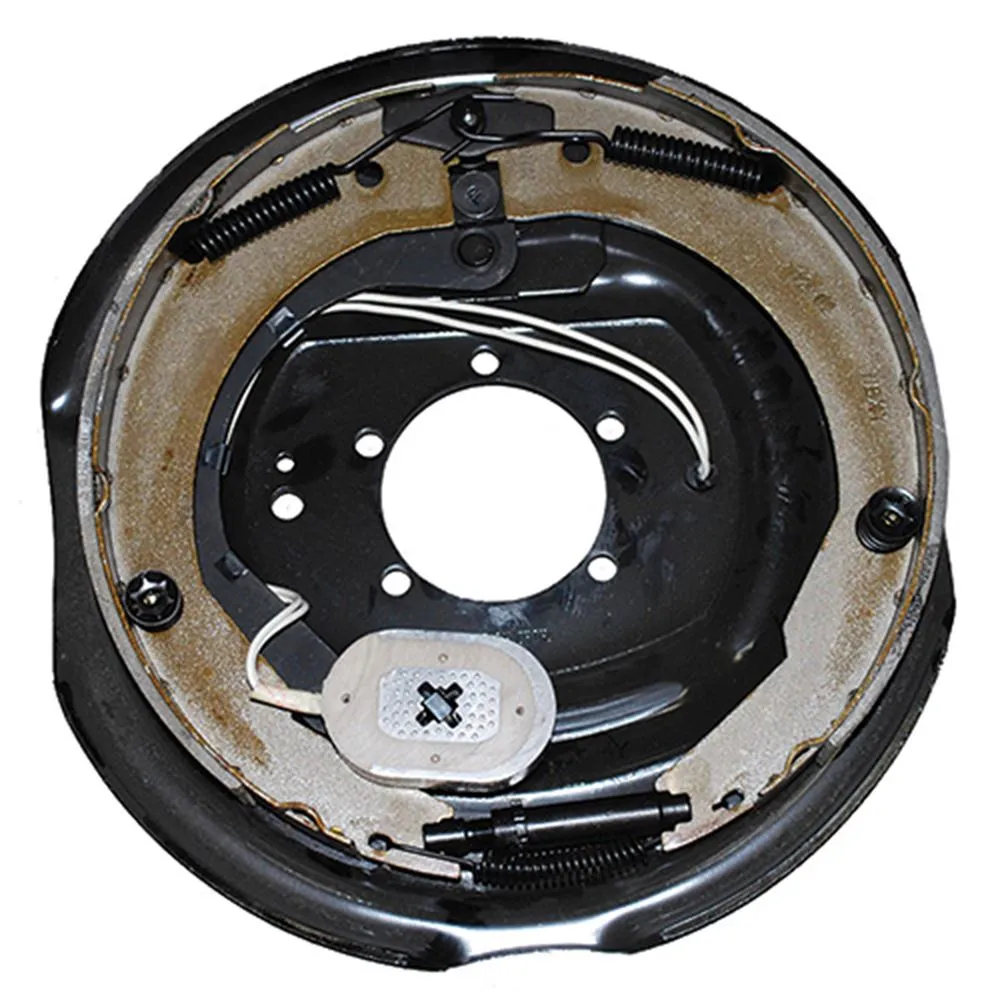 The left-hand electric brake assembly is 12 inches by 2 inches in size. The brake assembly comes complete with a backing plate, two brake shoes, upper double retracting springs, lower under-mount adjustment spring, magnet and wiring. Paired with a right-hand brake assembly,ASC #36787, this brake assembly can handle trailers up to 7000 lb. capacity.
