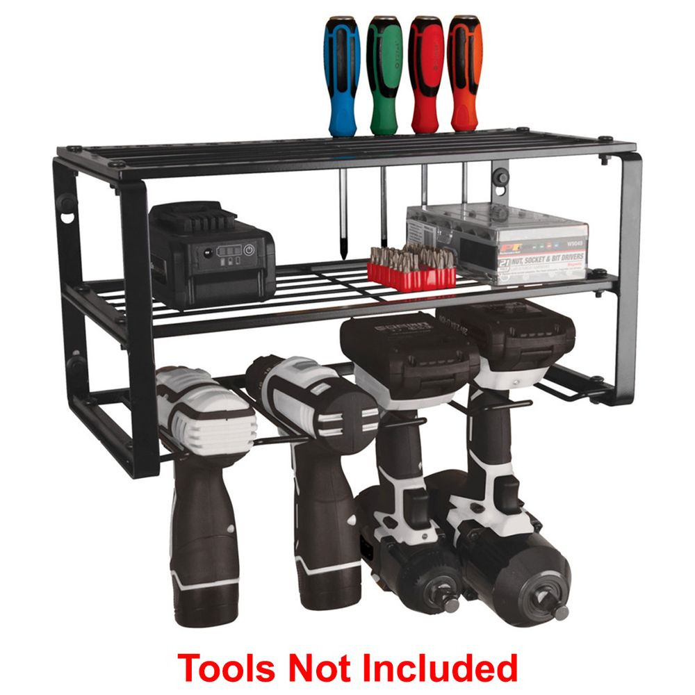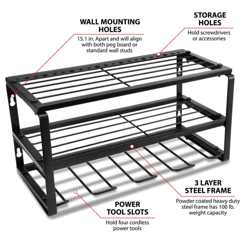 - The 3 levels of storage easily fit 4 power tools, chargers, batteries, and accessories helping to keep everything together and easy to grab when needed