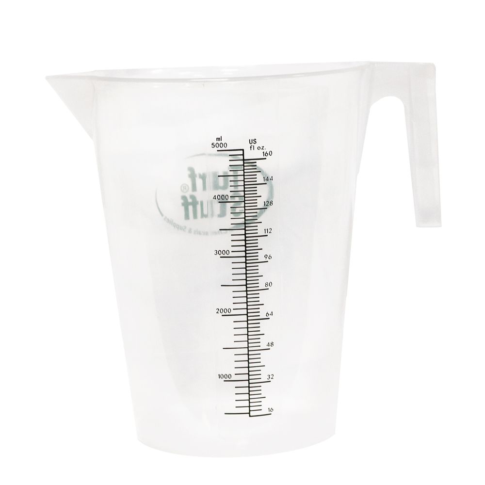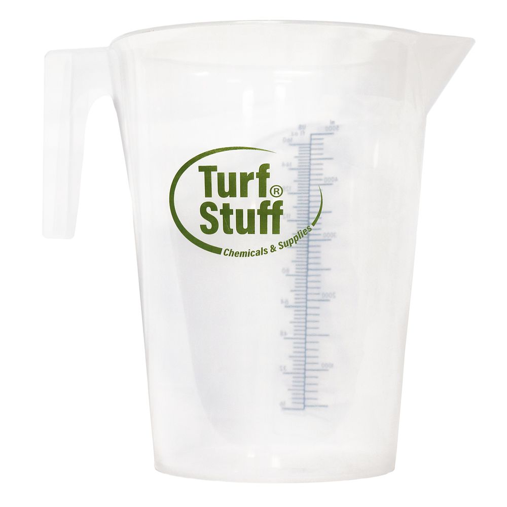 This Turf Stuff® is a large-capacity container with graduated markings for measuring both ounces and milliliters. Perfect for chemicals and supplies up to 160 ounces or 5000 milliliters.