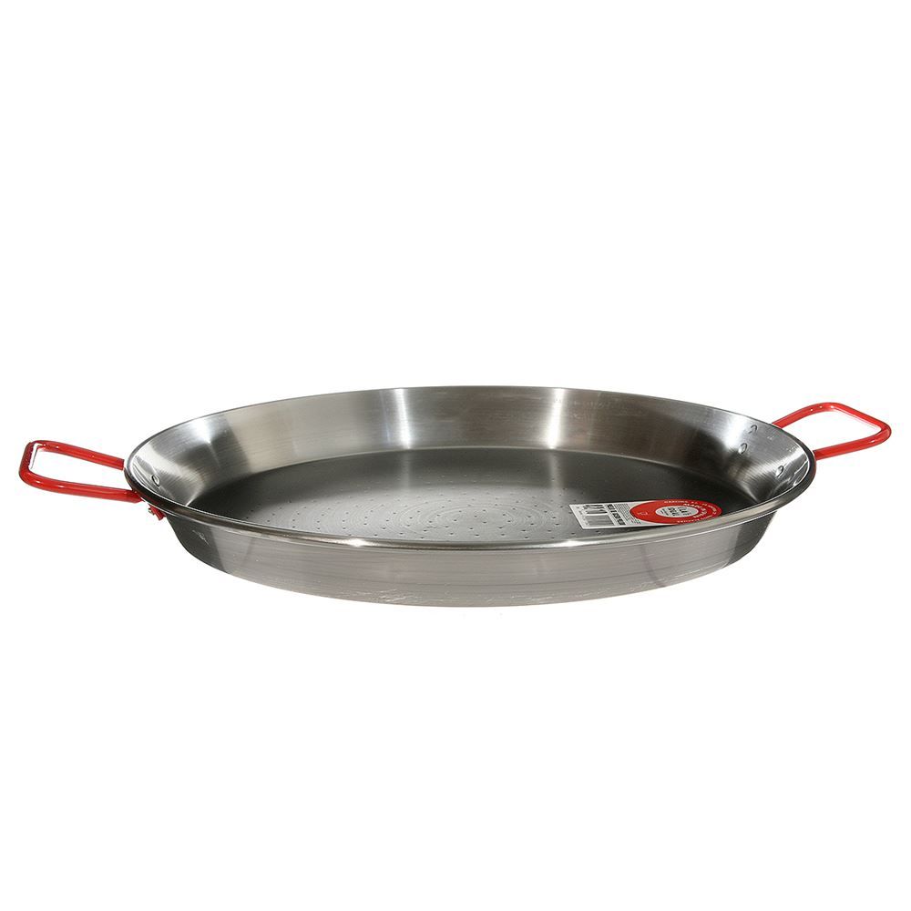 This pan is made of carbon steel, which is ideal for paella since it conducts heat quickly and evenly. Carbon steel is the traditional material for paella, and some paella devotees feel it enhances the flavor.