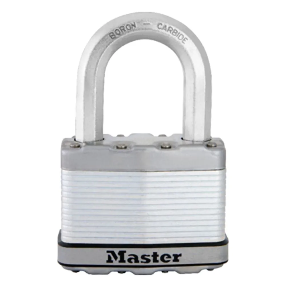 This Master Lock® Magnum padlock features a 2-1/2 inch wide laminated steel body surrounded by a resistant zinc outer coating. Features Tough-Cut™ boron-carbide materials that offer maximum resistance towards cutting and sawing.