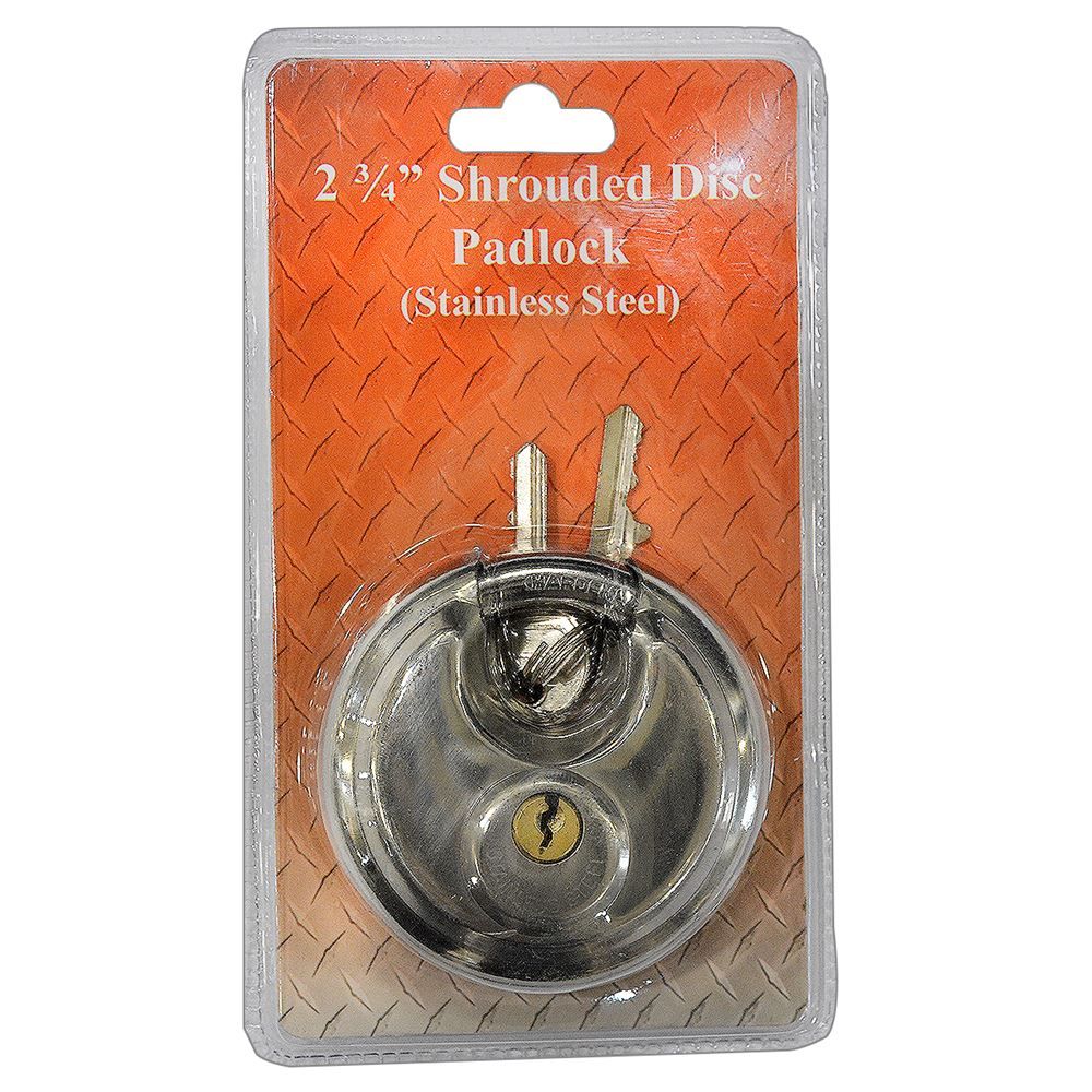 This 2-3/4 inch stainless steel shrouded disc padlock resists hammer blows and has reduced shackle exposure that helps prevent cutting.