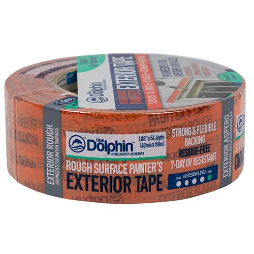 Blue Dolphin™ Rough Exterior Tape is engineered for rough uneven surfaces such as brick, stucco, cement and plaster. SuperGRIP™ high adhesion technology allows for 7-day removal time.