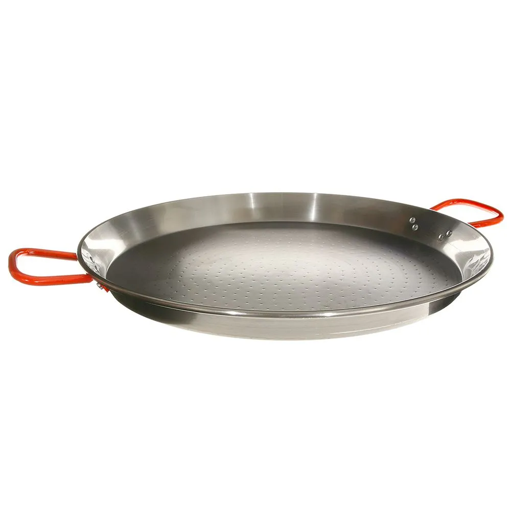 This pan is made of carbon steel, which is ideal for paella since it conducts heat quickly and evenly. Carbon steel is the traditional material for paella, and some paella devotees feel it enhances the flavor.