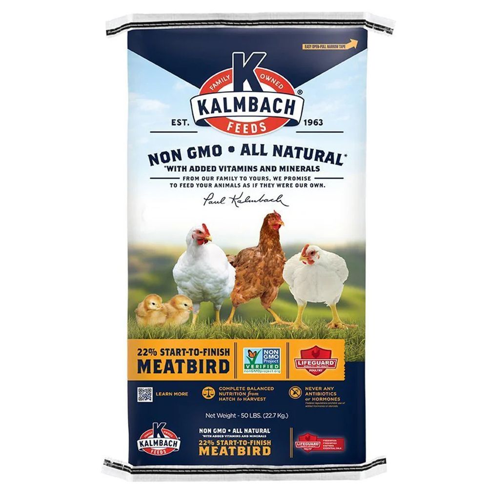 This 50-pound bag of Kalmbach 22% Start-To-Finish Meatbird is a non-GMO complete feed for starting and growing broiler chickens.