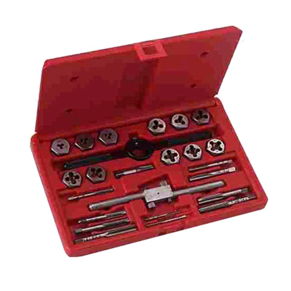 - Includes: Fractional plug tap and 1" hexagon dies in sizes: 1/4" x 20 NC, 1/4" x 28 NF, 5/16" x 18 NC, 5/16" x 24 NF, 3/8" x 16 NC, 3/8" x 24 NF, 7/16" x 14 NC, 7/16" x 20 NF, 1/2" x 13 NC, 1/2" x 20 NF Pipe thread plug tap and 1" hex dies in sizes: 1/8" x 27 NPT, Threading Tools, Plain Die Stock, 1" Dies, Offset adjustable tap wrench No. 0 - 1/2"