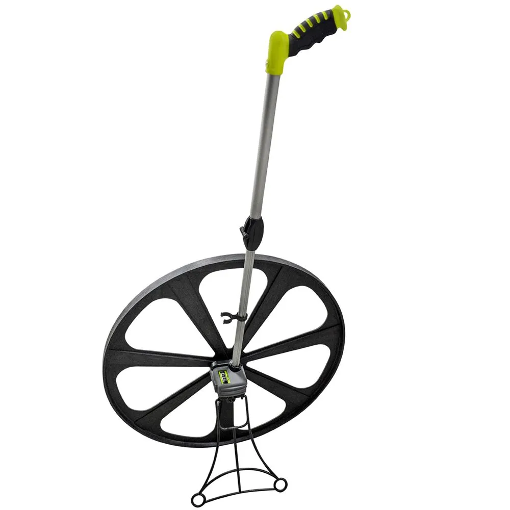 This 25" distance measuring wheel has a kick stand and a 5 digit counter that reads up to 10,000 feet. It also features a folding shaft for easy storage. This can be used for many applications including agricultural, construction, forestry, utilities, and more.