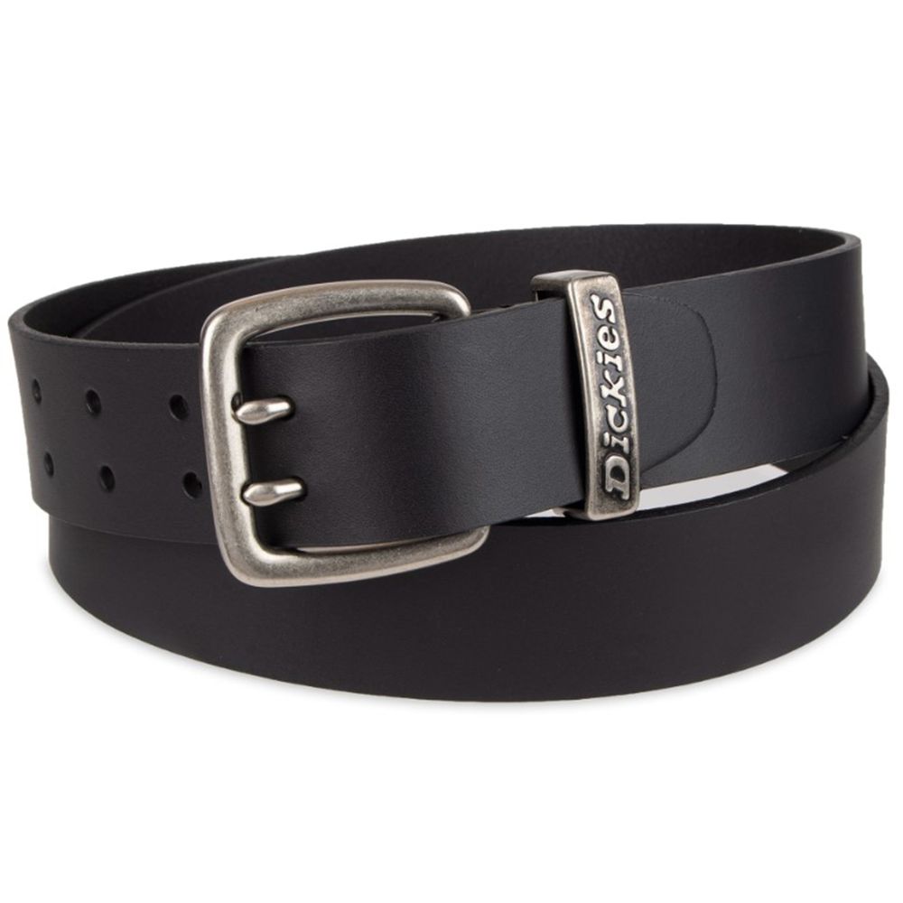 A casual black leather belt has a double-prong buckle. The buckle has a nickel finish and the belt is designed with durability in mind.