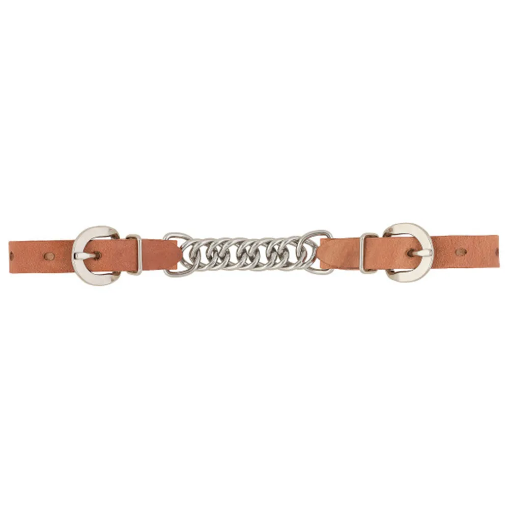 This single flat link chain curb strap is constructed from durable, weather-resistant russet harness leather, this 5/8" curb features a 3-1/2" flat single link chain.