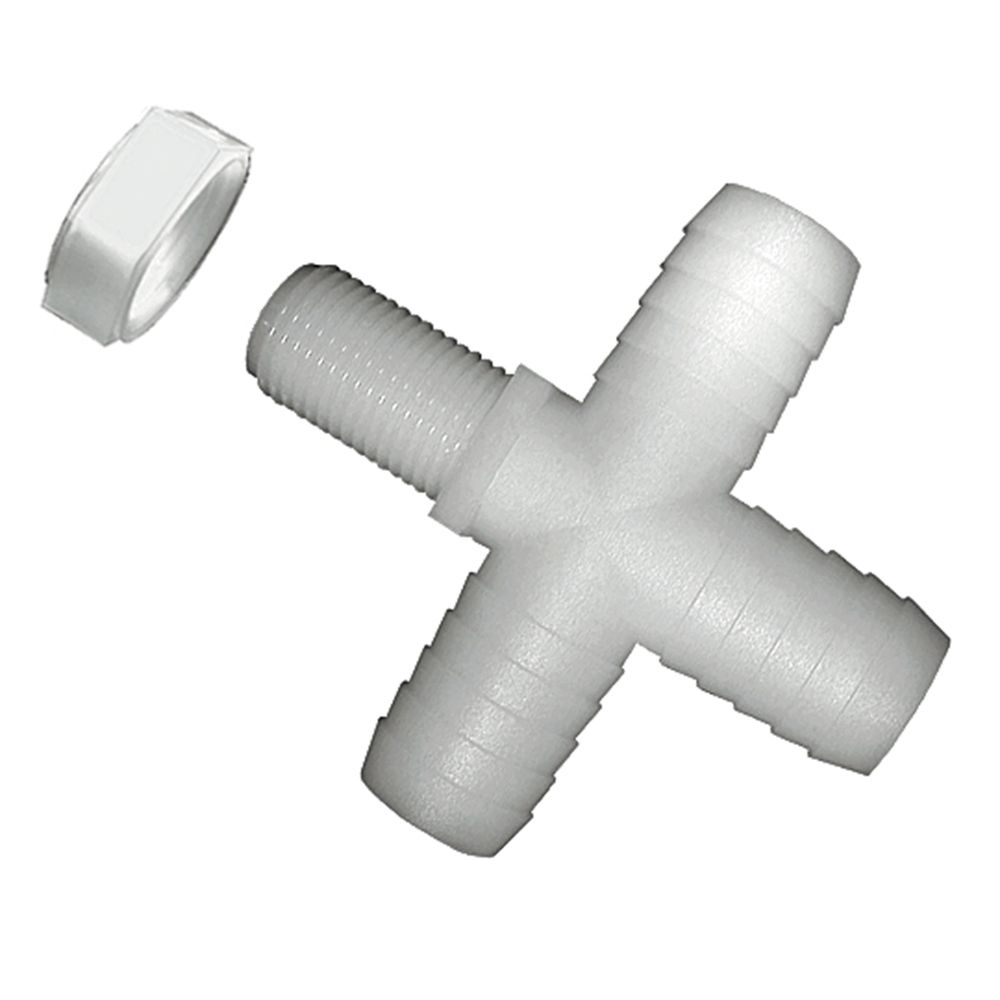 Use this 3/8" Nylon Cross Body to attach a spray nozzle to 3/8 inch hose