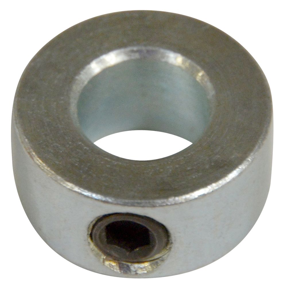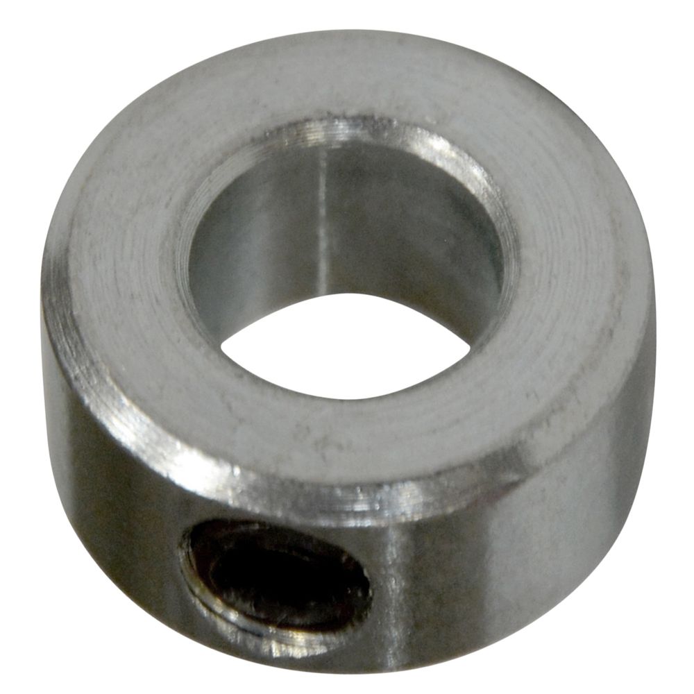 This 3/8" ID set screw collar is 3/4" OD and is 7/16" in thickness. It has one set screw. It is commonly used as stops on motors and gearboxes.