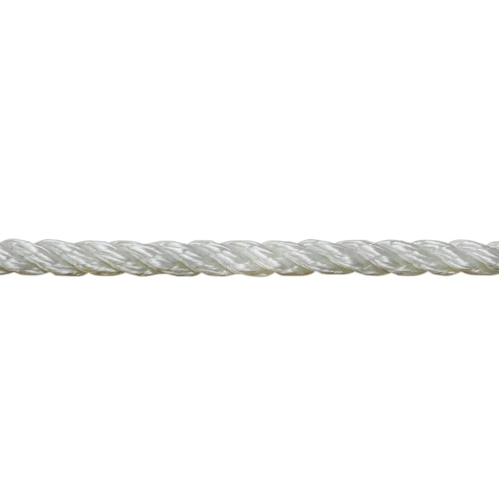 This 3-strand twisted nylon rope is strong, lightweight and flexible. It has an excellent resistance against abrasions, chemicals, mold and mildew. The diameter of this rope measures 5/16 inch, and it is sold by the foot.