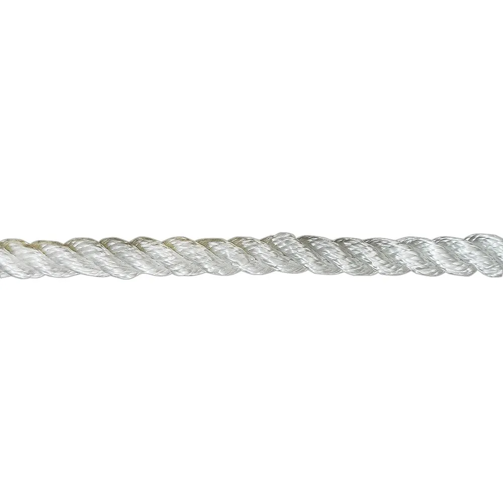 This 3-strand twisted nylon rope is strong, lightweight and flexible. It has an excellent resistance against abrasions, chemicals, mold and mildew. The diameter of this rope measures 3/4 inch, and it is sold by the foot.