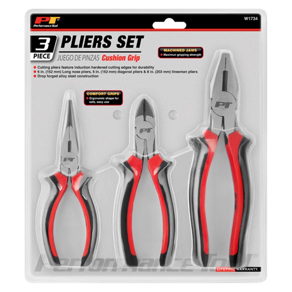 Here we have another quality tool from Performance Tools in this 3 pc. pliers set. Made from drop forged alloy steel, this 3 pc. pliers set is built to hold up to the rigors of repairing automobiles and equipment.