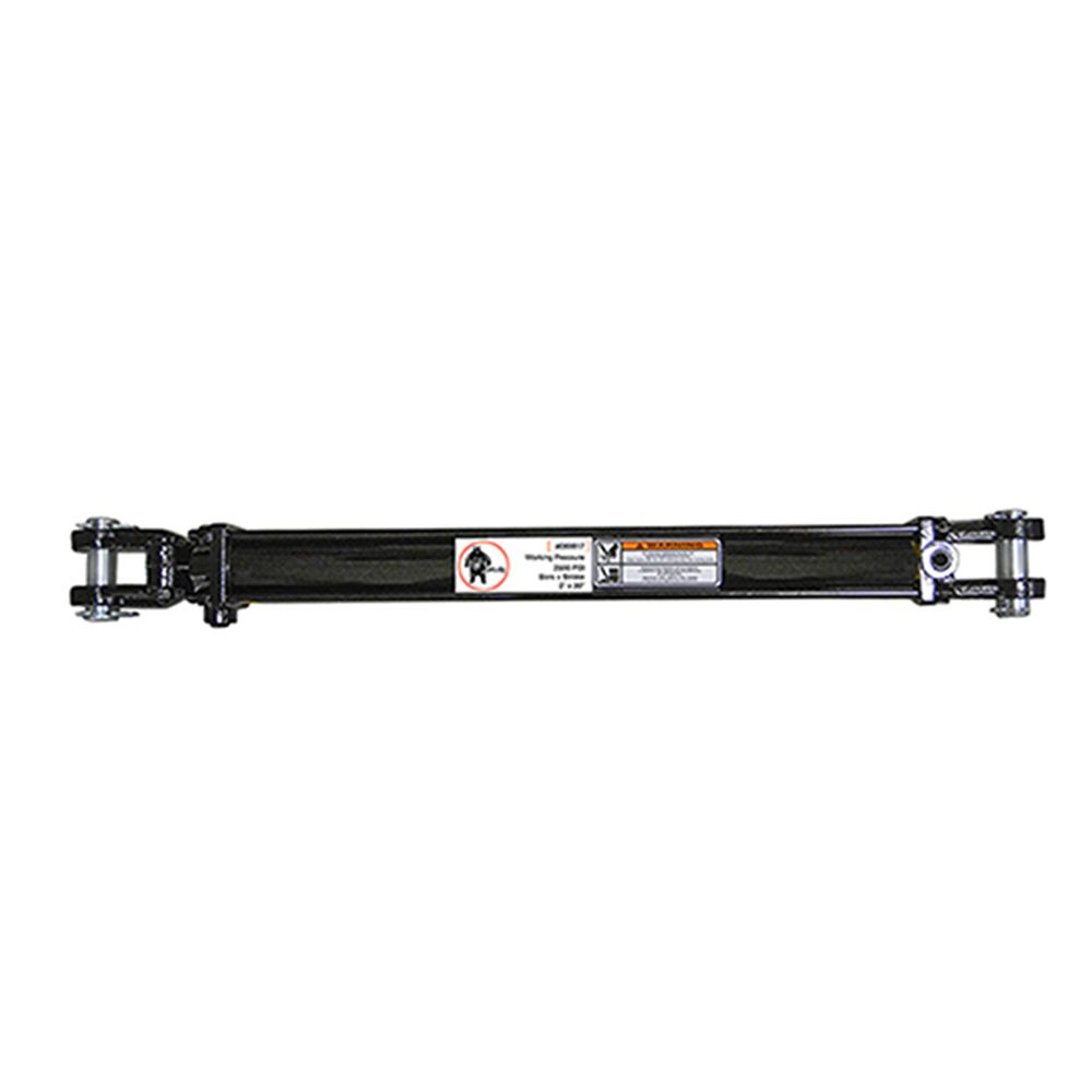 Hydraulic cylinders are constructed of high-strength steel and include tie rods to prevent high-pressure failure. This cylinder features a 4-inch bore with a 24-inch stroke and has a 1-inch pin.