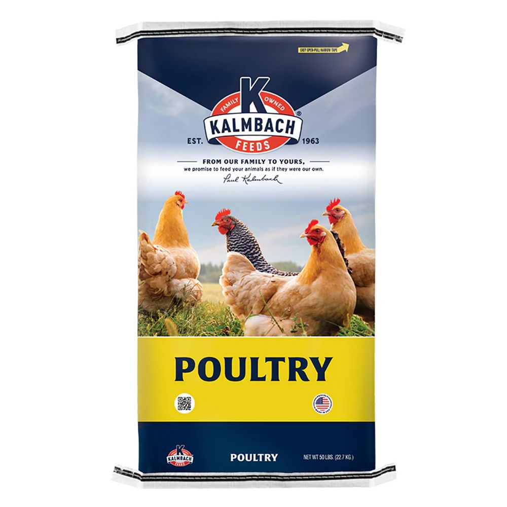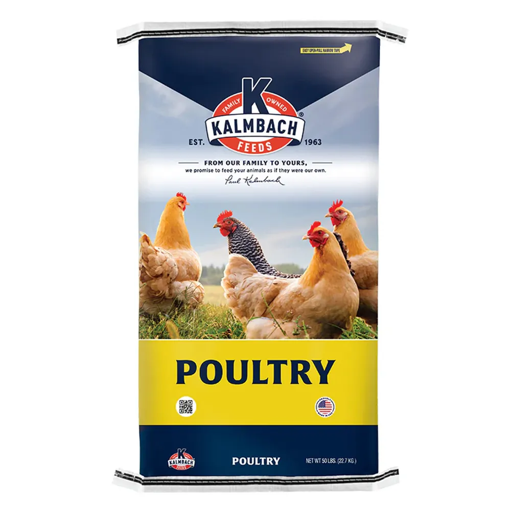 This 50-pound bag of Kalmbach® poultry supplement offers corn, feeding lime oyster shells, oats, fat, SBM, medication example, and protein. This bag contains high-quality animal proteins and a balance to meet the needs of a variety of poultry types.