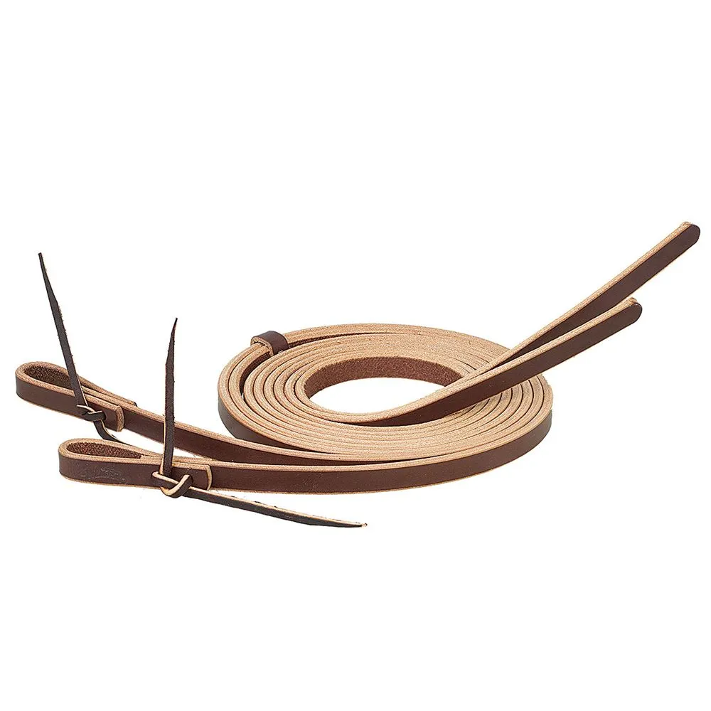 These reins are made from soft, supple burgundy latigo leather with a burnished finish. They feature water loops with alum tanned tie laces for easy replacement. Measures 5/8" x 7'.