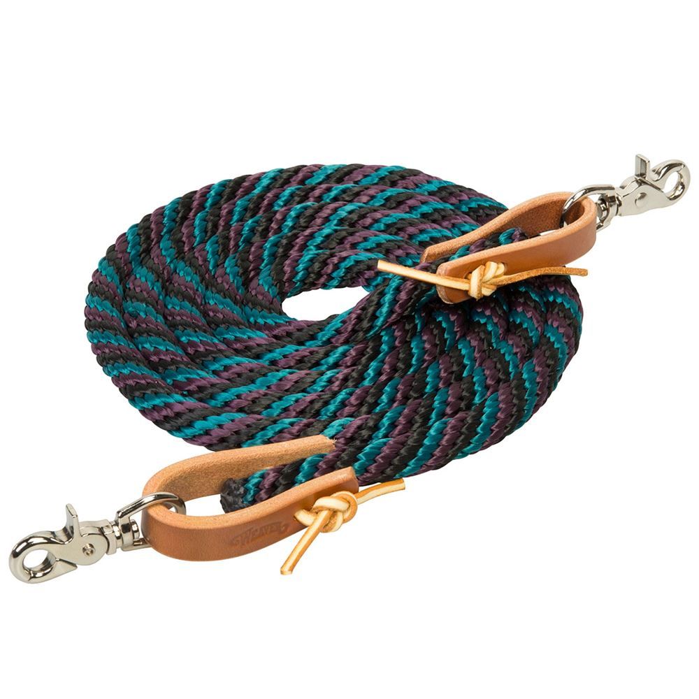 Time to saddle up? This poly roper rein will get you back out on the trail. It features two nickel-plated scissor snaps and watering loops with leather laces.
