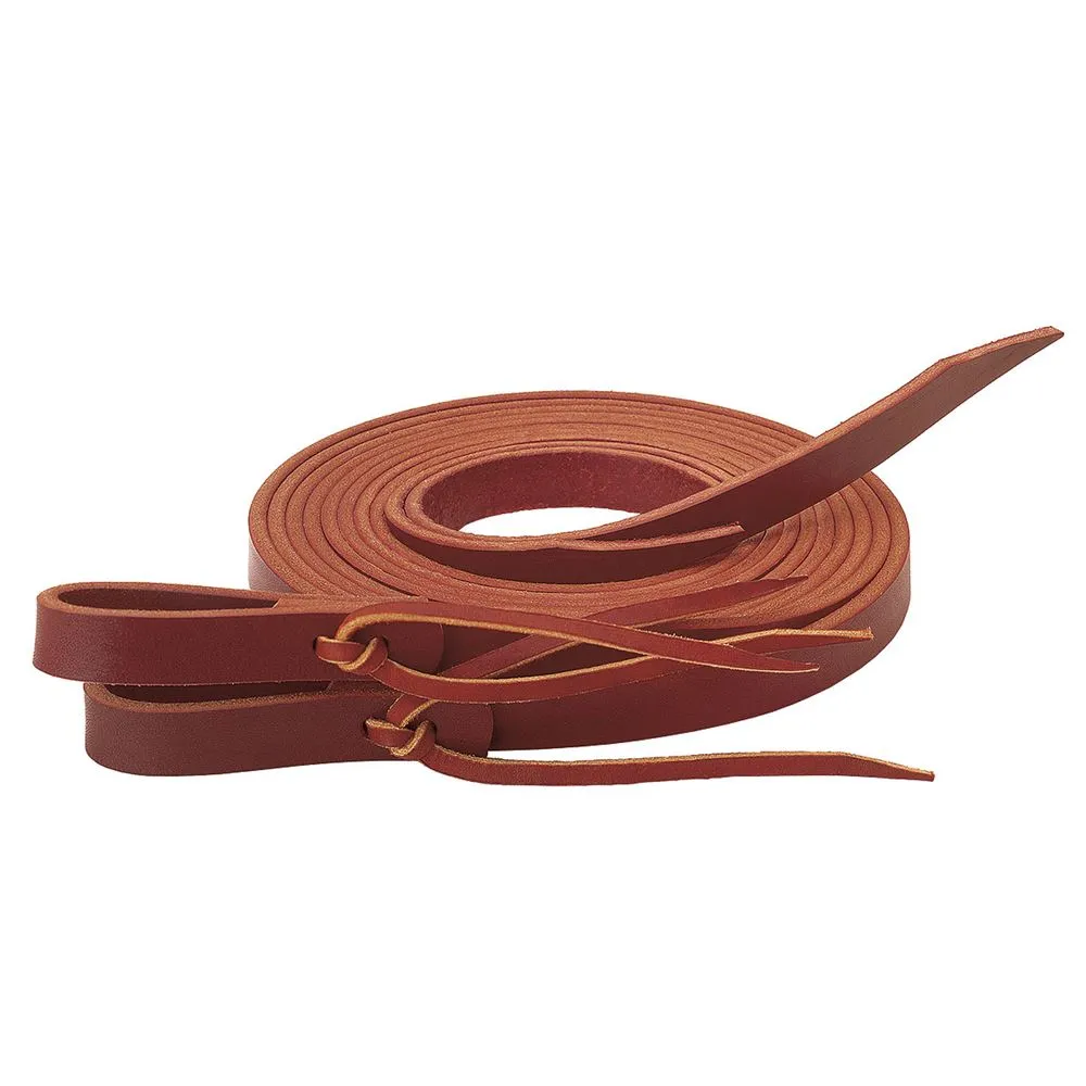 These reins are made from soft, supple burgundy latigo leather with a burnished finish. They feature water loops with alum tanned tie laces for easy replacement. Measure 5/8" x 8'.