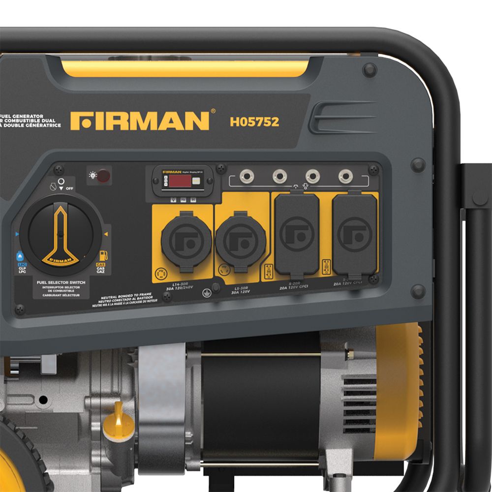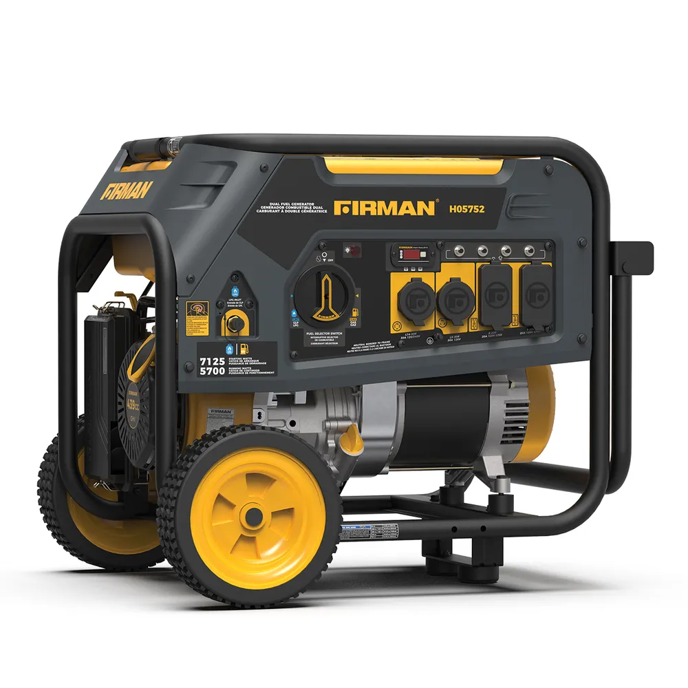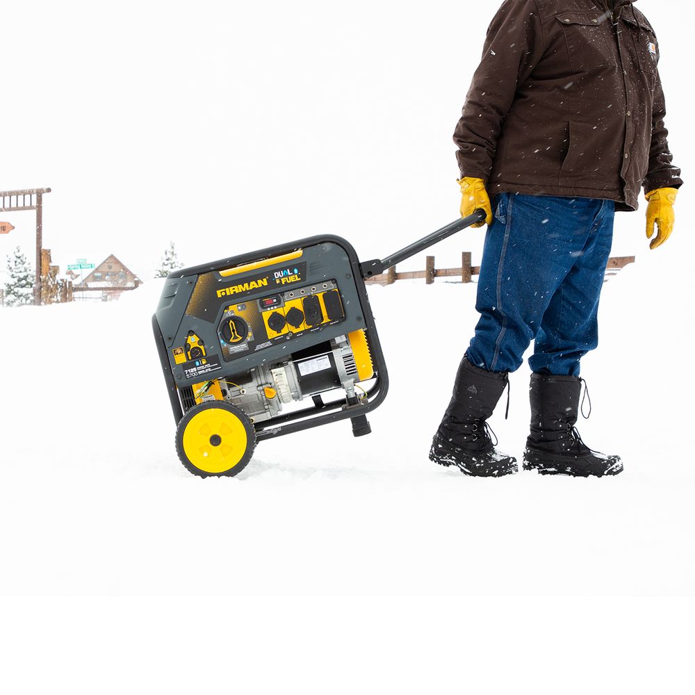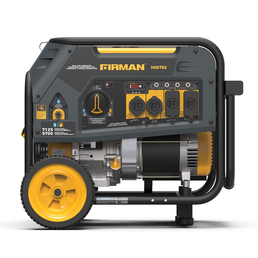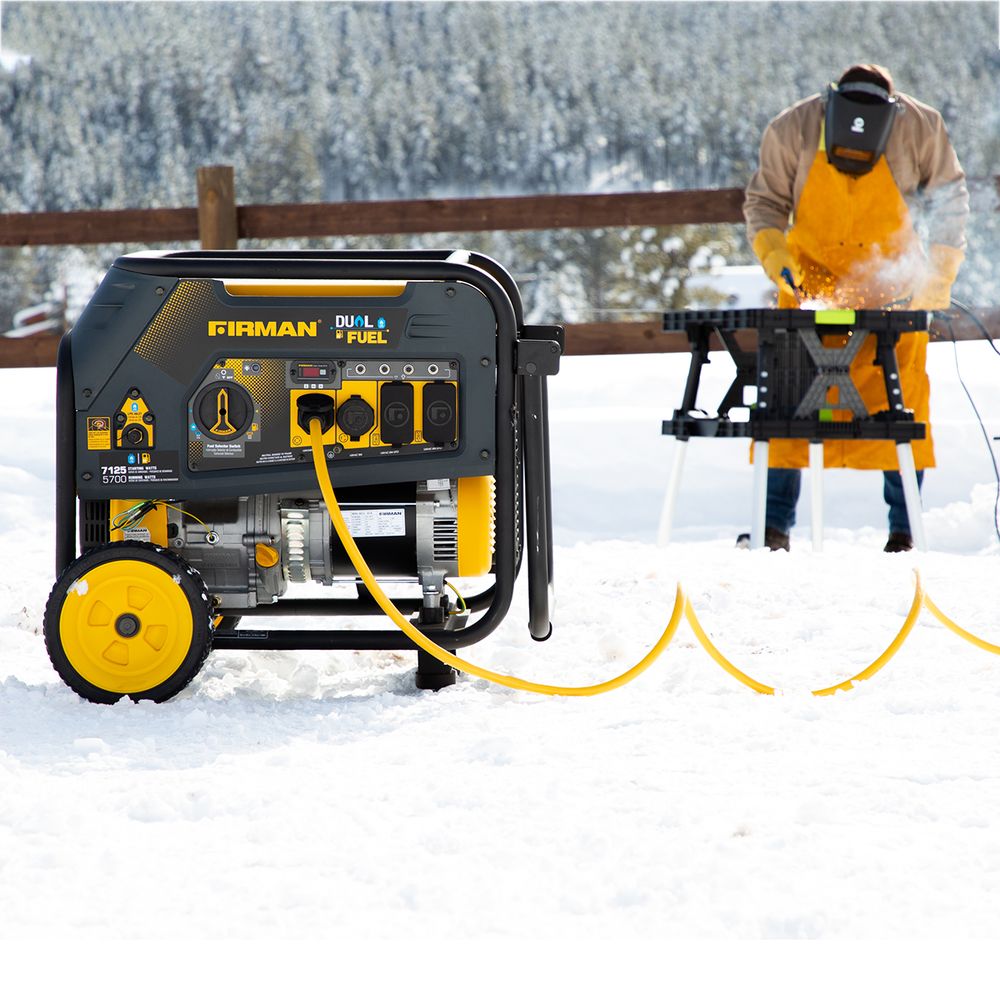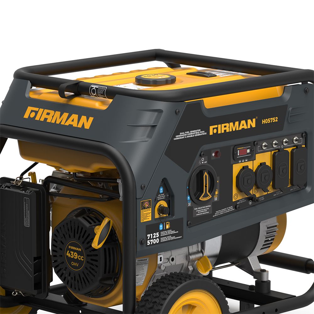 This dual-fuel portable generator has a 5700W recoil start is 120/240V and can run on gasoline or propane. Offering a long-lasting performance even in the most challenging situations.