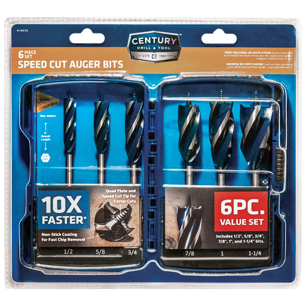 This Century® 6 Piece Speed Cut Auger Bit Set includes one each 1/2 inch, 5/8 inch, 3/4 inch, 7/8 inch, 1 inch and 1-1/4 speed cut auger bits.
