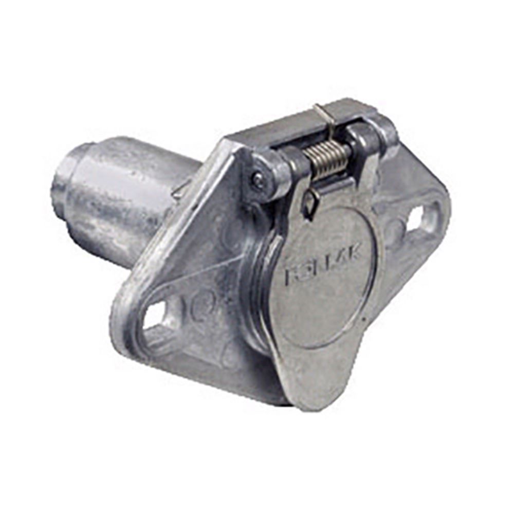 This 6-pole socket connects the trailer plug to the tow vehicle. It has a zinc die cast housing with round split brass pins and is self-grounding.