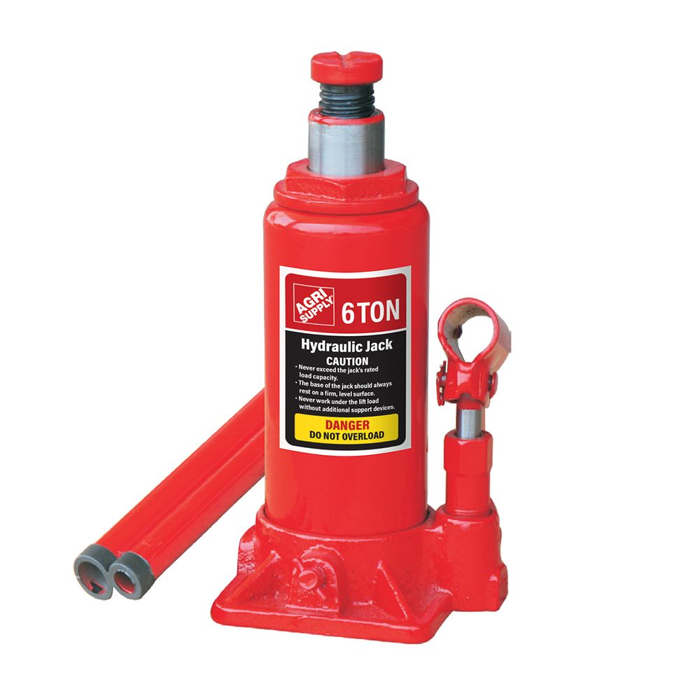 This hydraulic bottle jack handles lifting loads up to 6 tons and has a heat treated extension screw that allows for low pickup jack adjustments and a maximum lifting height. This hydraulic bottle jack is made with reinforced critical stress points for added durability and strength