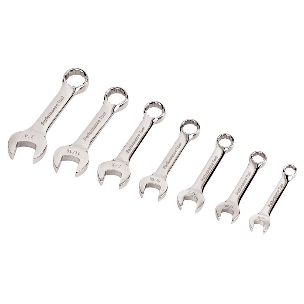 Here we have another quality tool from Performance Tools in these fully polished stubby wrenches. Having a nickel-plated finish to resist corrosion, these wrenches are built to hold up to the rigors of repairing automobiles and equipment.