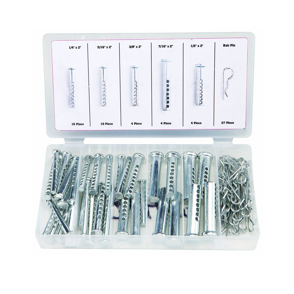 This 74-piece universal clevis pin assortment is a handy collection of clevis pins and clips in various sizes. Clevis pins are versatile fasteners that join two pieces, allowing them to rotate or pivot around the pin. The "universal" aspect usually means the pins have multiple holes along their length, offering flexibility in securing the pin with a cotter pin or clip.