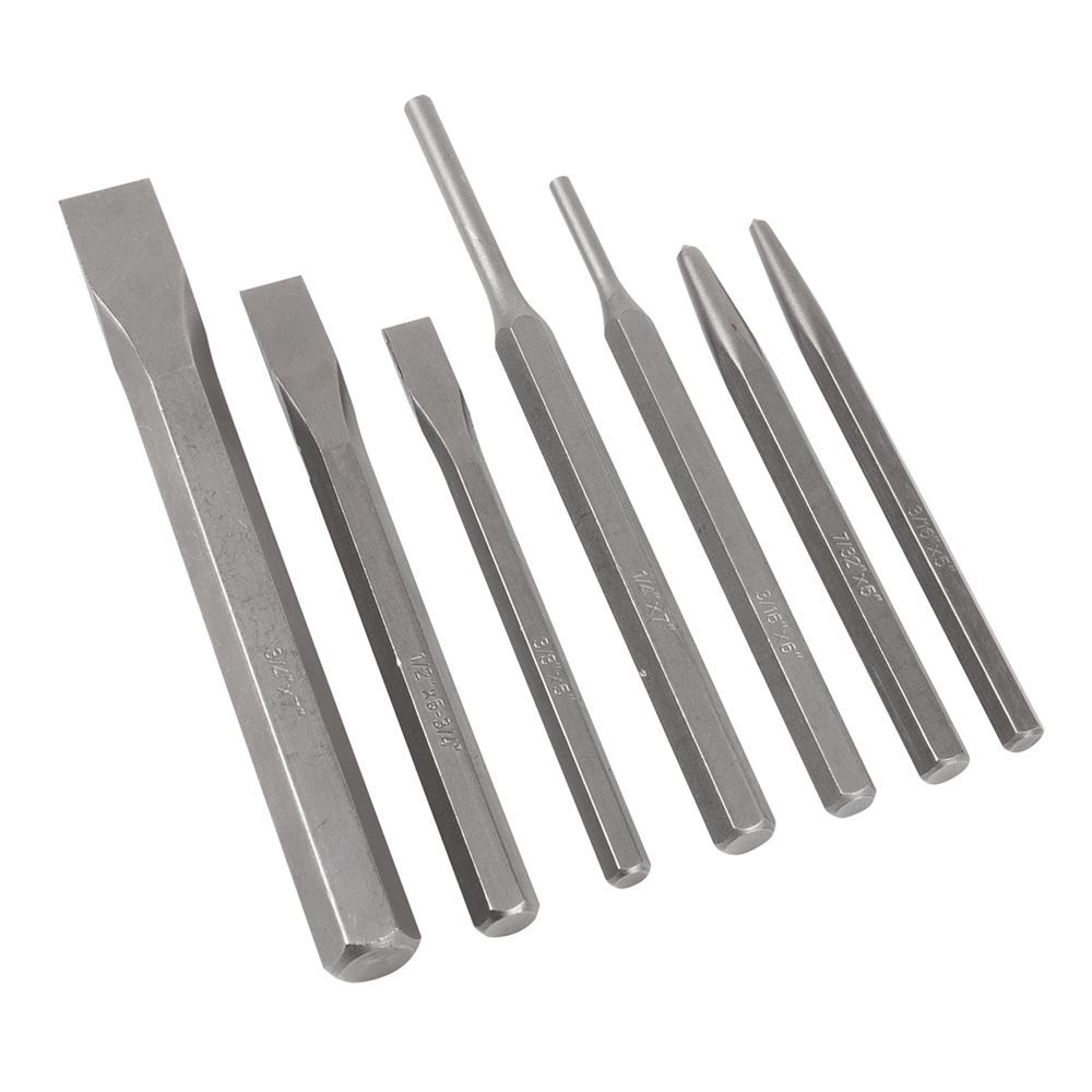 • (2) Center punches: 3/16" x 5", 7/32"x 5" (2) Pin punches: 3/16" x 6", 1/4" x 7" (3) Cold chisels: 3/8" x 5", 1/2" x 5-3/4", 3/4" x 7"