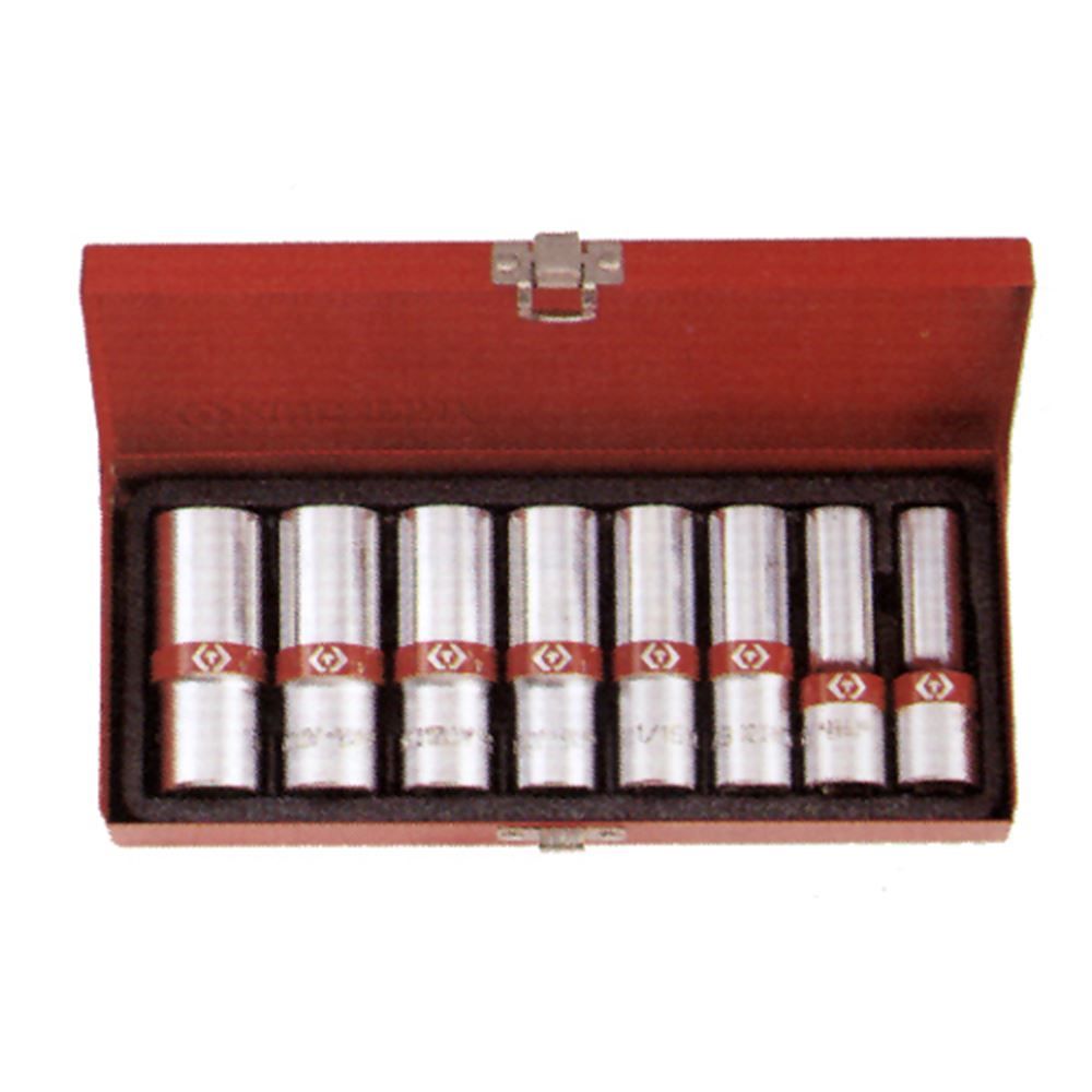This 3/8 in. drive, 6 point socket set is heavy duty and built to last. By King Tony, this socket set includes 8 pieces ranging from 3/8 inch to 13/16 inch. The socket set is made of a chrome molybdenum alloy steel and finish.