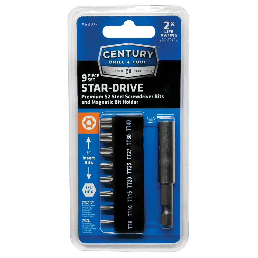 This Century® 9 Piece Star Drive Bit Set With Magnetic Holder includes one each T8, T10, T15, T20, T25, T27, T30, T40 star bits and one magnetic bit holder