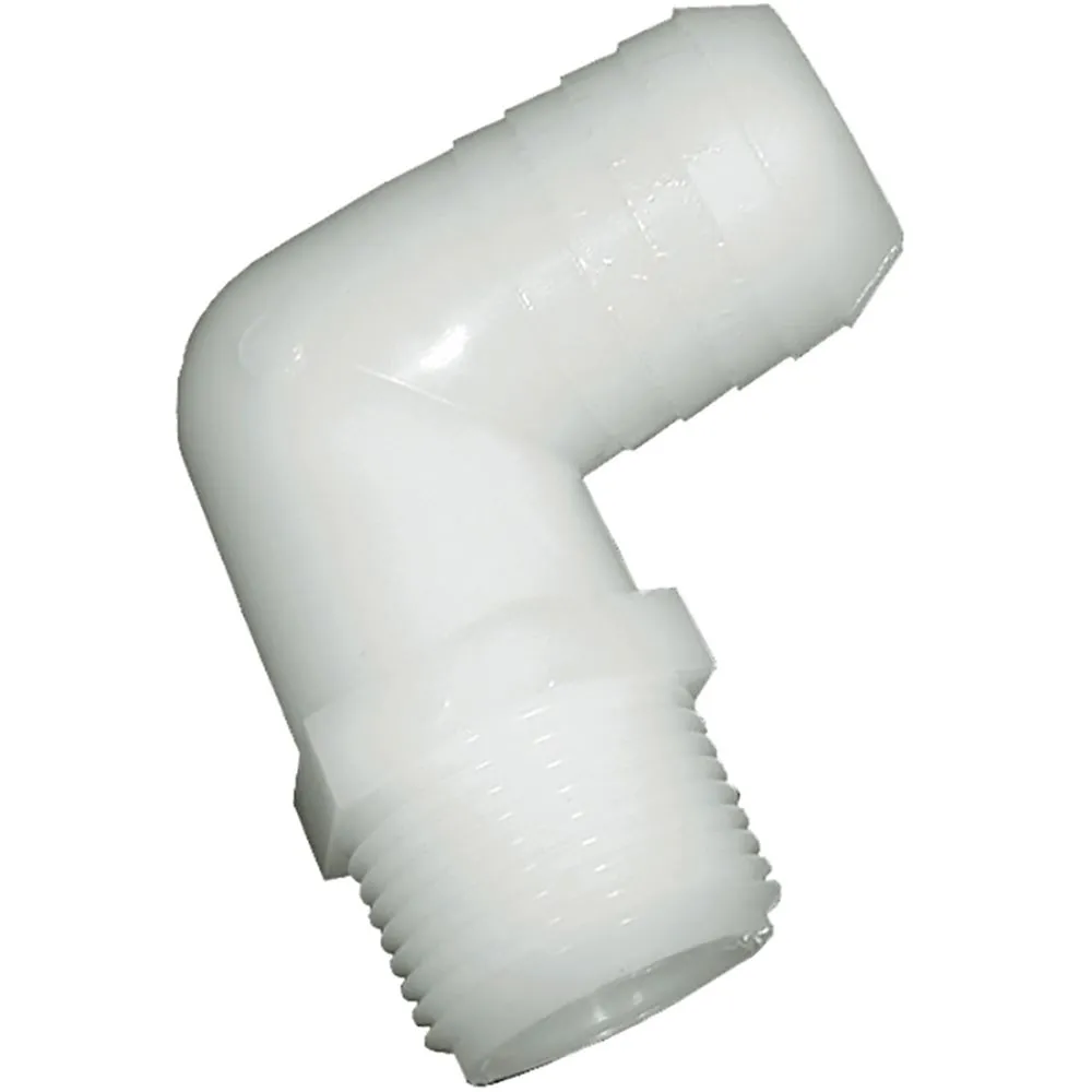 This nylon 90° elbow has a 1/4 in. male pipe thread and a 1/4 in. hose barb.