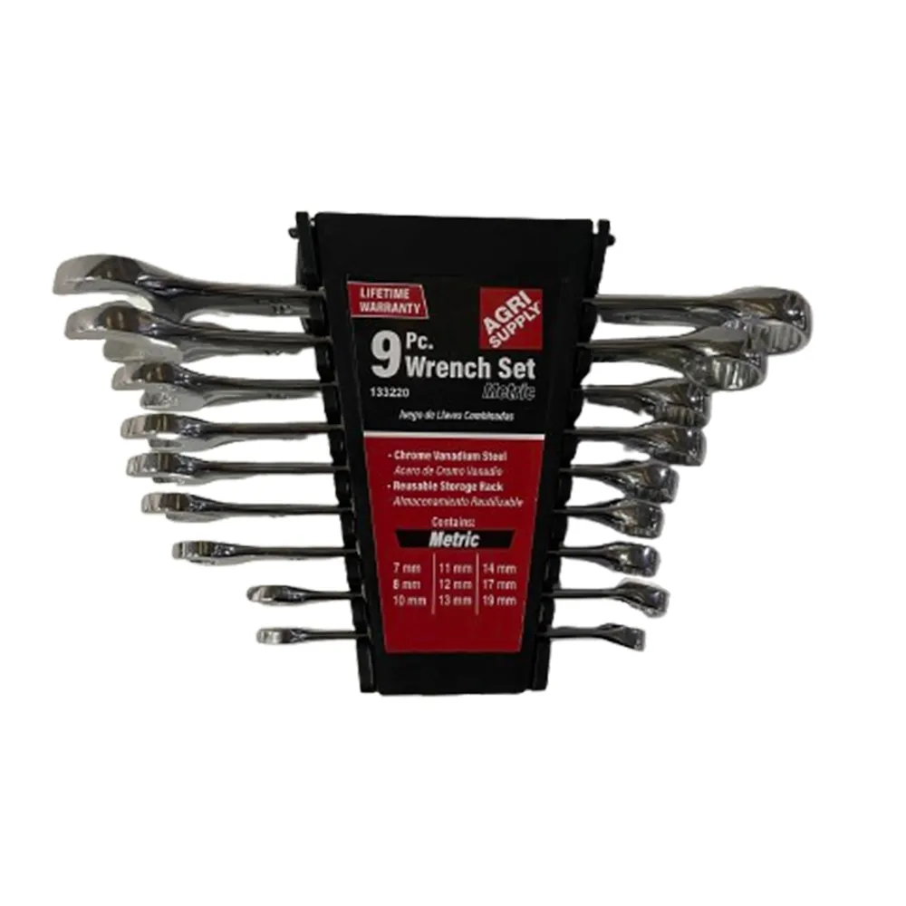 This combination wrench set includes standard wrenches in metric sizes. This set comes in a convenient plastic holder and includes 9 pieces.