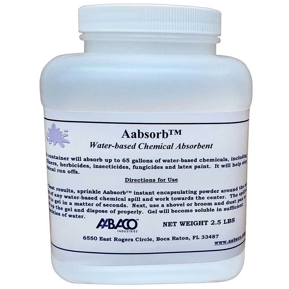 Aabsorb™ chemical absorbent is an encapsulating powder which will absorb any water-based chemical including herbicides, fertilizers, fungicides, and insecticides to stop chemical run offs, and can even turn latex paint into gel. This product is effective to clean up water based chemical spills and works quickly and safely. This one 2.5 lb. jar will absorb approximately 65 gallons.