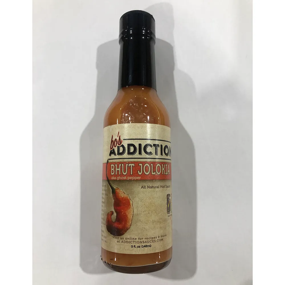 Addiction Sauces Bhut Jolokia Sauce is made from the bhut jolokia, also known as the ghost pepper which comes from Northeast India. Natural pineapple and banana sugars along with the punch of vinegar are added to make a rich, spicy sauce.