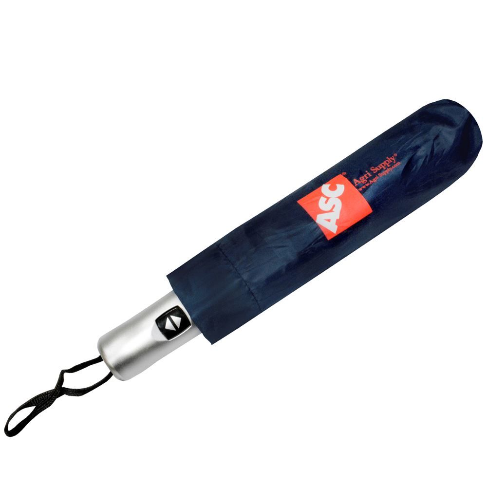 This Agri Supply Co. ® logo folding umbrella is a compact 11 inches and comes with a convenient carry case. The navy blue umbrella is a 20 inch umbrella with the turned down edges opening to a complete coverage of 30 inches. The stylish two tone handle features a wrist strap and an automatic open and close button.