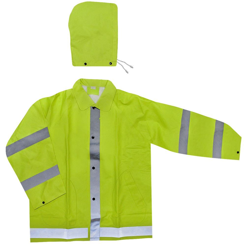 This top quality construction reflective color florescent green rain jacket is full cut for maximum comfort. It's made out of durable polyester/PVC construction along with a detachable hood with drawstring. This reflective/safety jacket has easy to use snaps and air vents under the arms for air circulation. The jacket is 100% waterproof and a size X-Large.