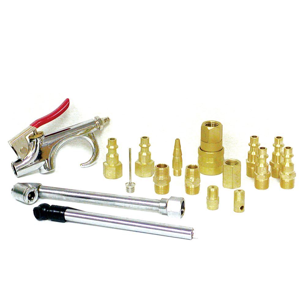 Easy to use 17-piece air accessory kit which includes (1) Air Blow Gun, (1) Dual Tire Check, (1) Pencil Tire Gauge, (14) Couplers & Adaptors.