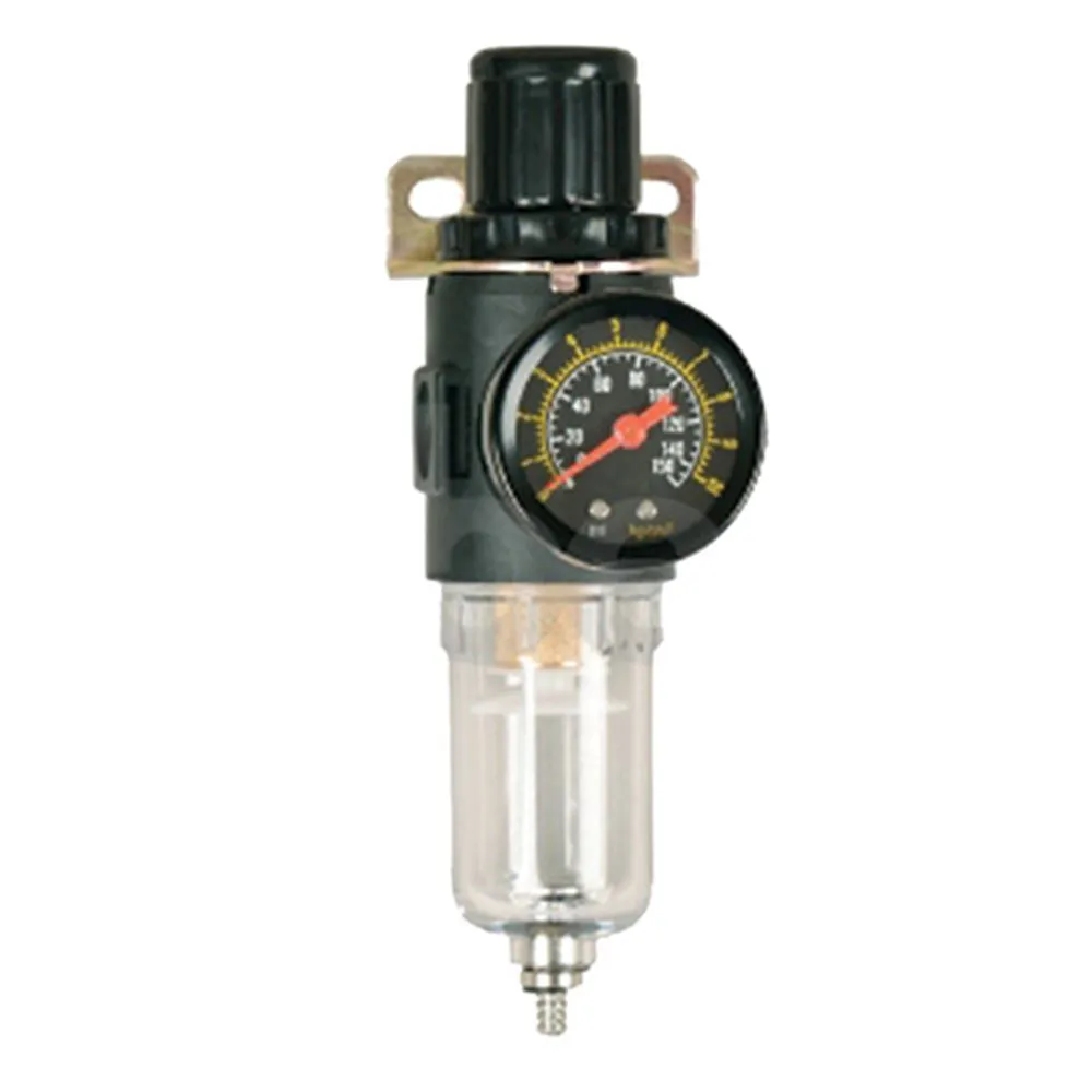 Help keep your system running with this air pressure regulator and incorporated filter. This air regulator has a 1/4 inch inlet and 1/4 inch outlet and a pressure range of 0.05 MPa to 0.85 MPa. The easy to read dial measures from 0 to 150 psi. The regulator has a locking adjustable knob to keep you settings in place.