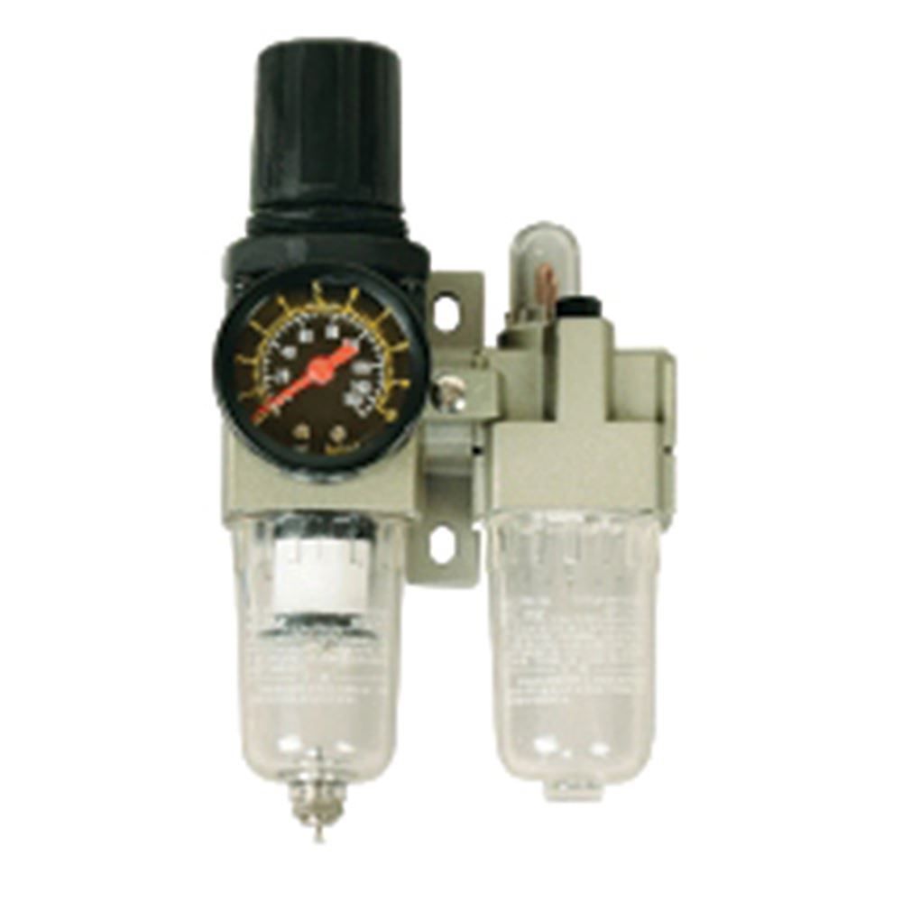 This two point combination air filter, regulator and lubricator unit helps you filter air, regulate pressure and add oil to your system. The air filter is 25 micron and the regulator has a pressure range between 0.05 and 0.85 MPa. The inlet and outlet are both 1/4 in.