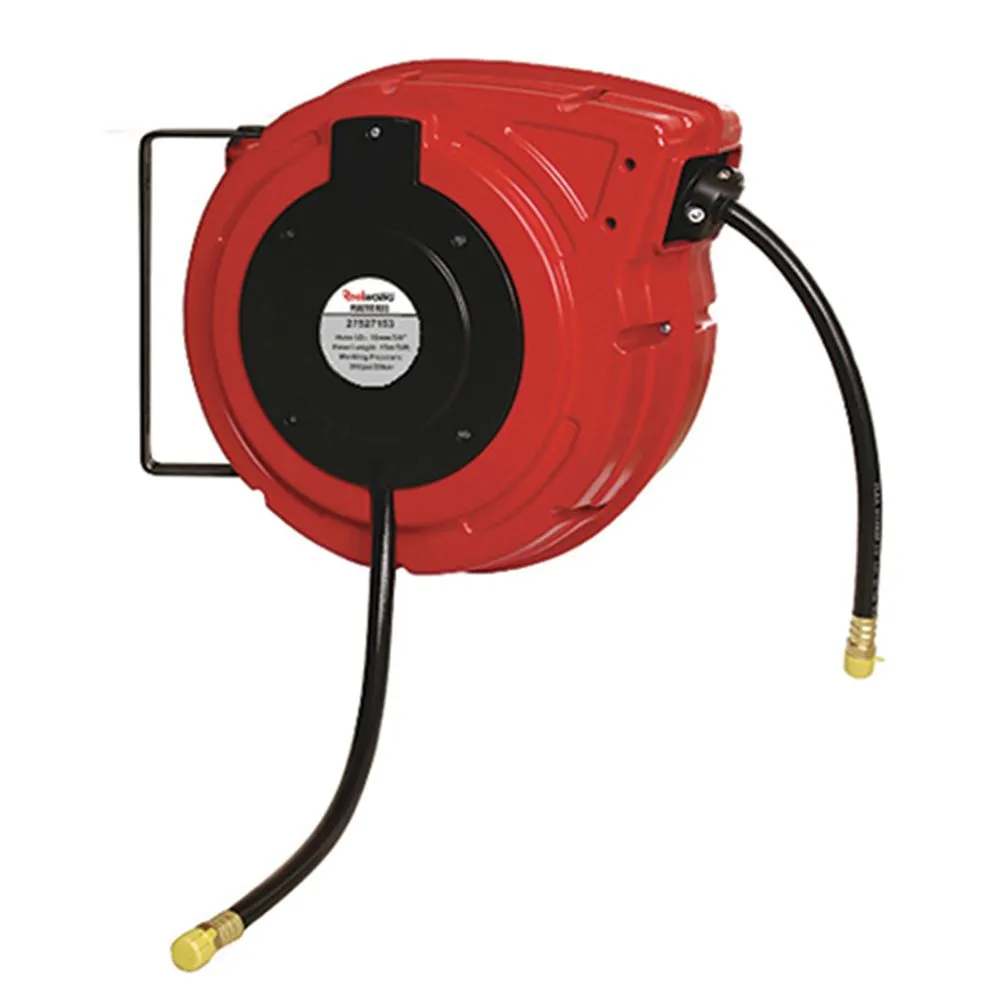With a swivel mounting bracket, this air hose reel can easily mount to your wall or ceiling. The bracket swivels 180 ° for easy use. The air hose is a hybrid polymer and has a large bend radius to help eliminate kinks. The hose is 3/8 in. in diameter and 50 foot long. The air hose reel comes with a 24 inch lead-in supply hose.