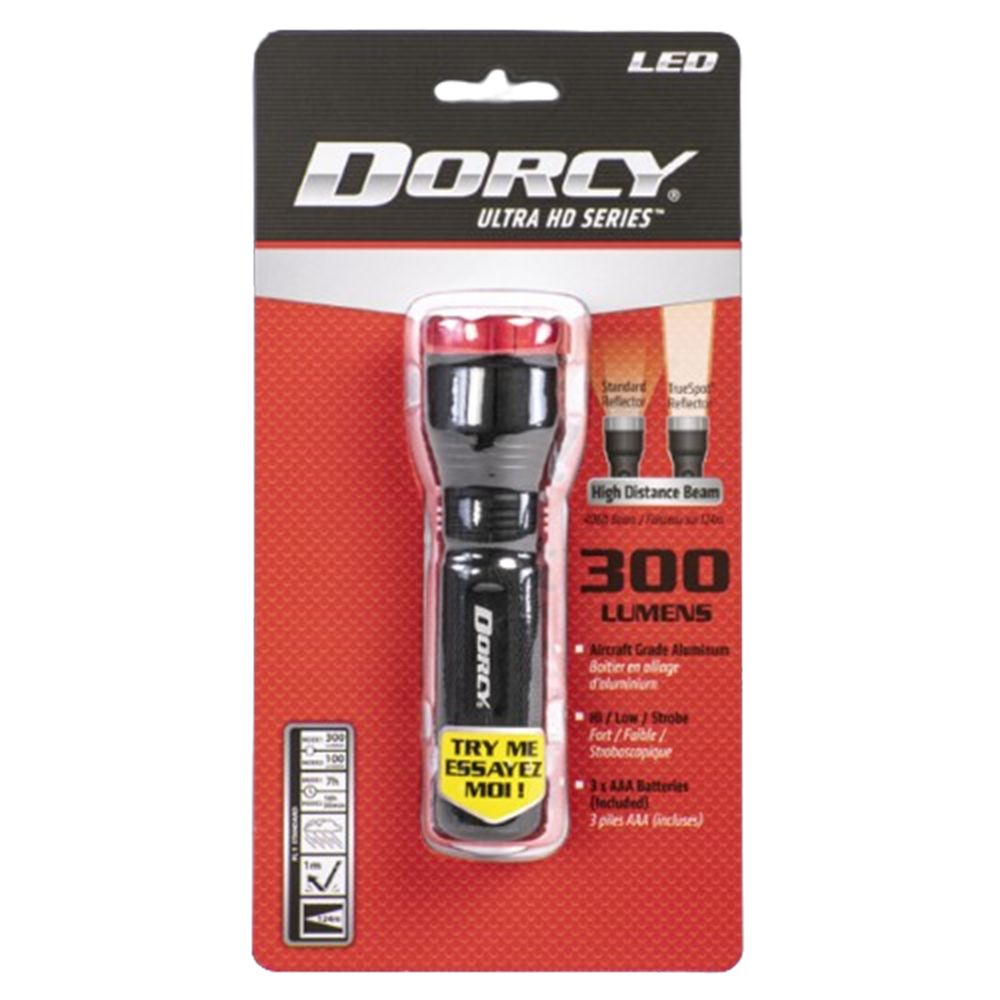 Great to store in glove compartments and emergency kits, this flashlight has a compact size of 5 inches length x 1-1/2 inches. The powerful 220 lumen lighting on this Cree LED bulb flashlight shines at a distance of 510 feet.