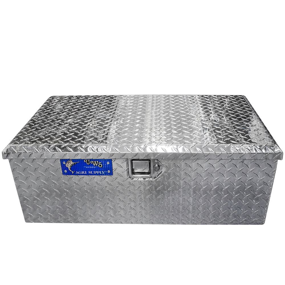 D-FOOTLOCKER - Footlocker Aluminum Tread Plate Toolbox. These Footlockers are secure and lockable with our tough stainless steel locking latches. The heavy aluminum boxes don't rust or pick up musty odors as wood and cardboard boxes will. Sized large enough to do the job, they also have convenient folding handles that make moving them easy. They feature the strong insulated foam lid that cuts condensation and provides superb protection for the contents. It's built tough enough to take anywhere you go no matter how rough it gets. The lid opens to a full 90 degrees; thus easily allowing it to be loaded with large and bulky items. The dimensions for this footlocker are 36 inches long x 19-1/4 inches wide x 12 inches deep.