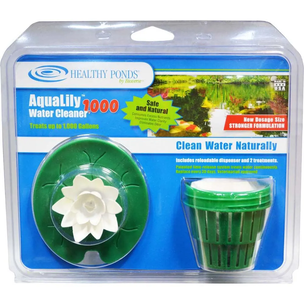 A simple solution to backyard pond maintenance. This AquaLily™ dispenser contains a pack with a proprietary mix of natural bacteria and enzymes that reduces the nutrients that causes the green growth. Fill the dispenser with one bacteria pack which will work for 30 days, then requires a new pack. This dispenser floats and shows a decorative lily lid. It may take 4 to 6 weeks to achieve the best results with this natural pond cleaner, but there is no way to overtreat the water. Water may range in temperature from 45° F to 110° F. Do not to mix other chemicals in water when using the AquaLily™ as it may cause more damage to the water.